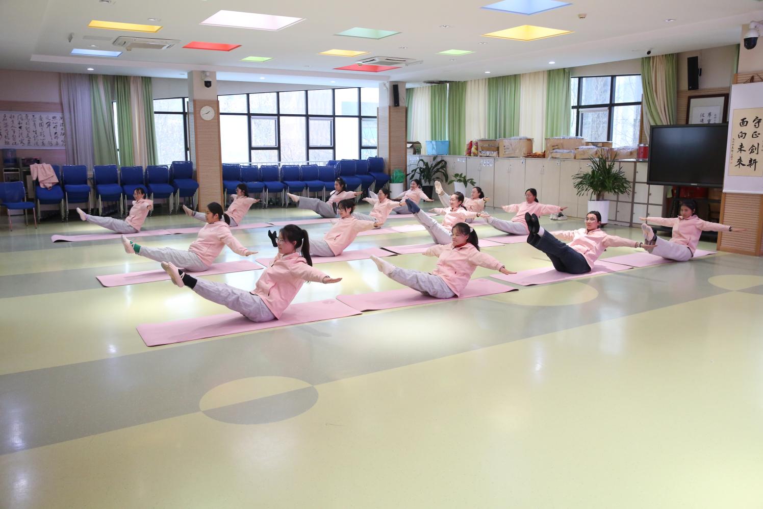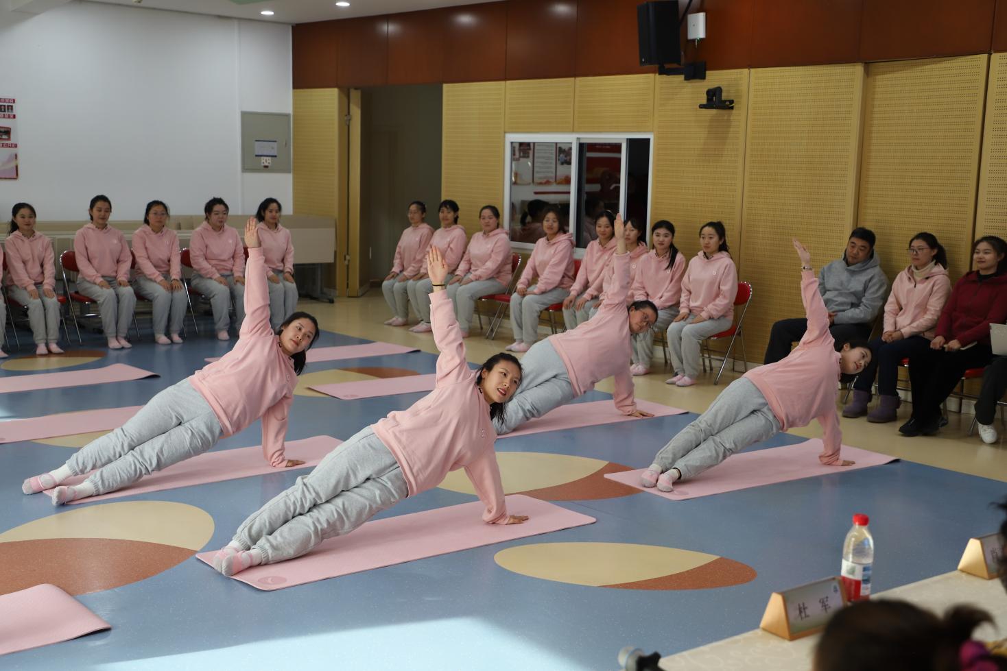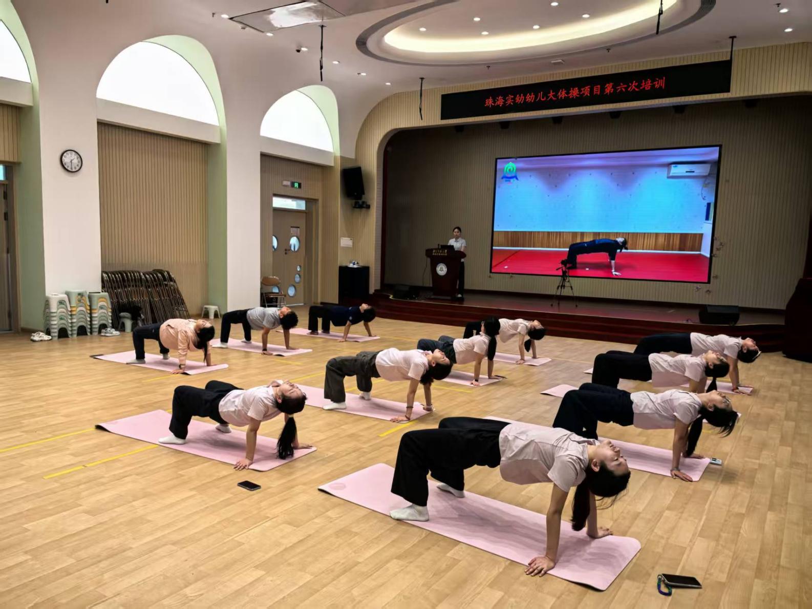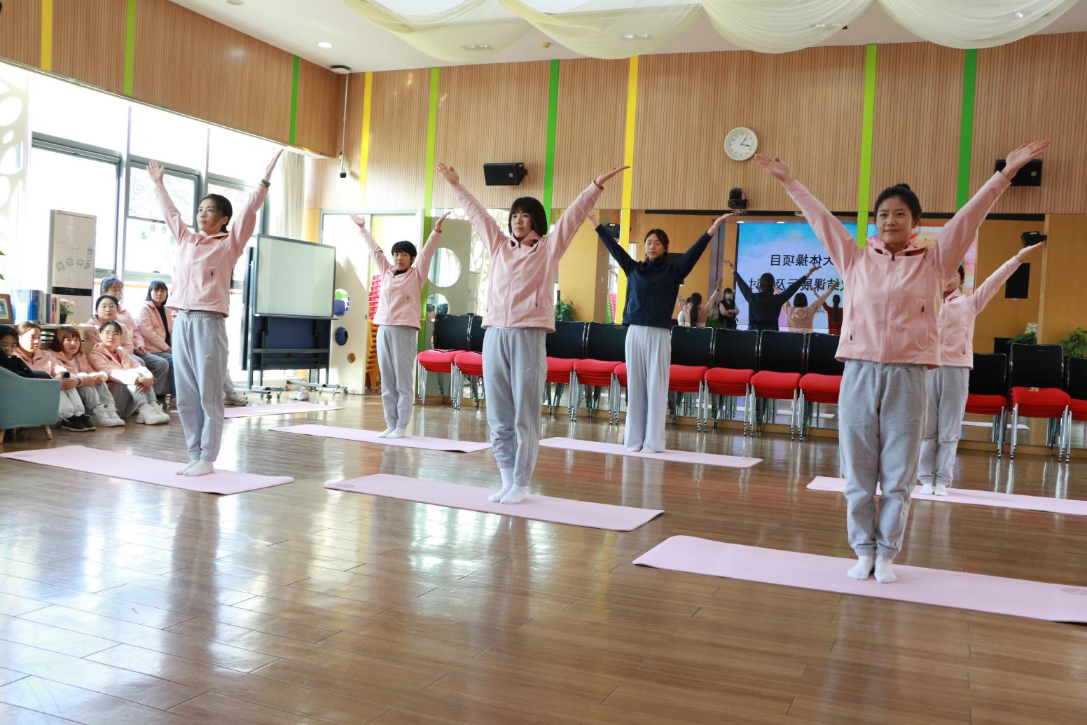 在展示环节,各分园教师依照小班、中班、大班的顺序依次展示。教师们统一着装,以饱满的精神面貌亮相,从体操站姿、坐姿、手型、膝盖发力、脚背绷直,到支撑动作与双人配合环节,每一个细节都把控精准。经过前期专业教练的系统指导与动作打磨,教师们勇于挑战自我、突破身体瓶颈,全程高质量展现出操节基本动作,将体操的力量与柔美完美融合,充分彰显培训后的专业成长。
