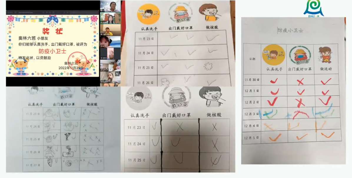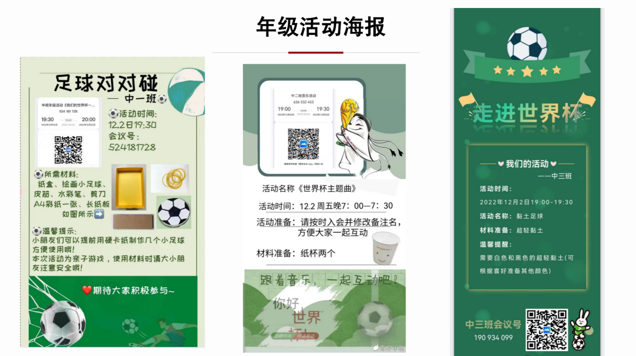 2022年12月7日,黄珊总园长为各园搭建线上交流分享平台,各园将两周居家线上家园工作开展的阶段性经验和亮点内容进行汇报展示,各具特色,精彩纷呈。有在园期间班级主题的延伸活动;有打通班级界限的年级组联盟活动;有响应社会热点的世界杯主题活动;有基于居家生活的美食制作活动;还有基于习惯养成的自我服务、运动打卡、阅读分享活动;等等。各园基于科学的计划制定,严谨的过程性教研和反思性的阶段复盘,不仅在推进居家线上指导的工作中促进了教师团队的专业性成长,更是用科学、高质量的活动赢得了幼儿的喜爱和广大家长的一致好评。此次分享活动发挥了集团的资源优势,促进了园所间的交流学习,有力推进了家教指导的专业化提升。
