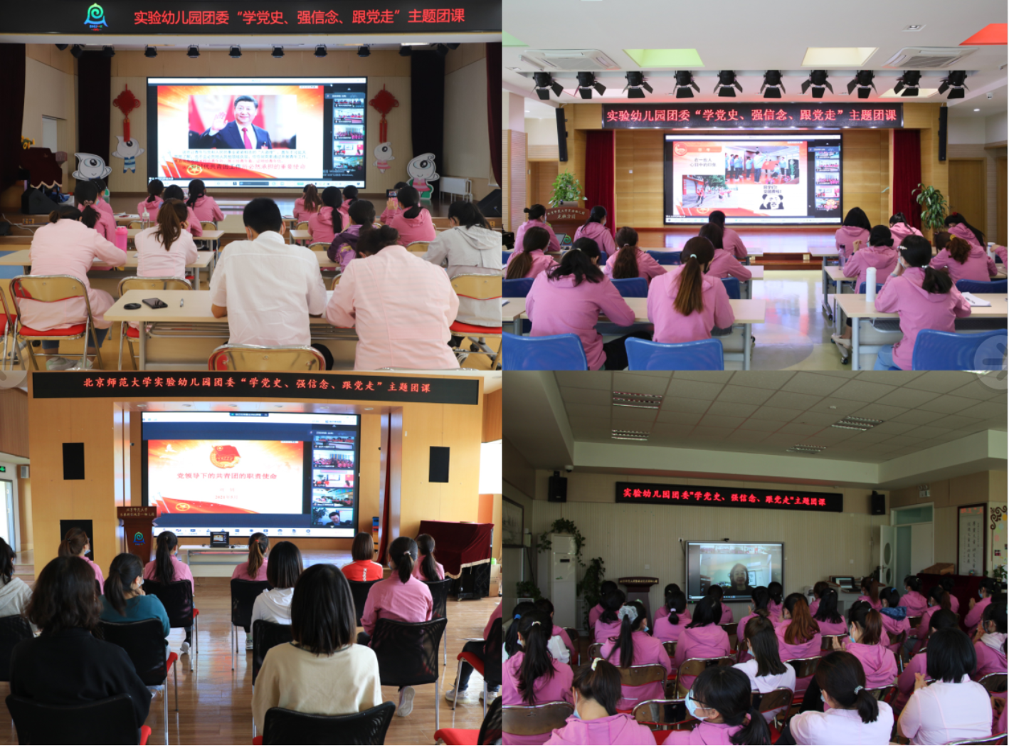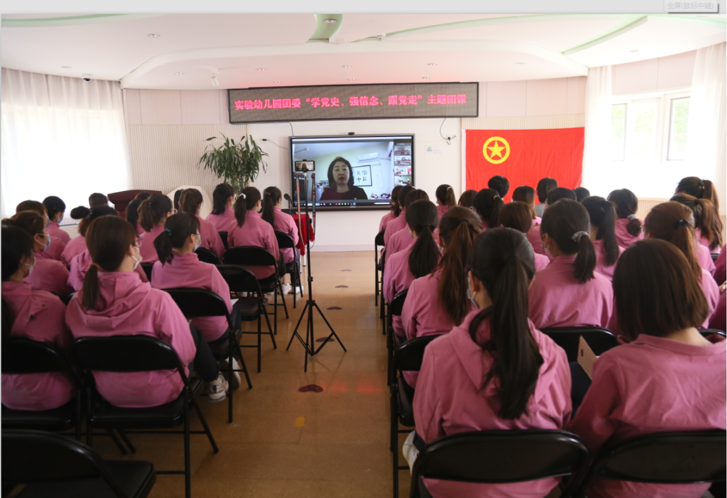 为庆祝五四青年节,推动党史学习教育走实、走深,5月8日,幼儿园团委组织全体团员青年开展“学党史、强信念、跟党走”主题团日活动。活动由幼儿园团委书记李灵子主持,采用线上线下相结合的方式,牡丹分园团支部为主会场,其他各园团支部集中在各园在线聆听,共计282位团员教师参加。