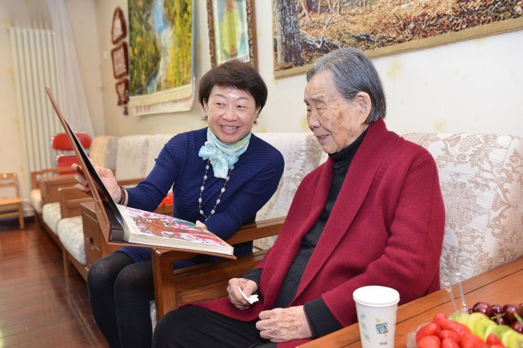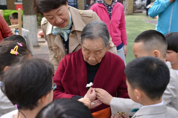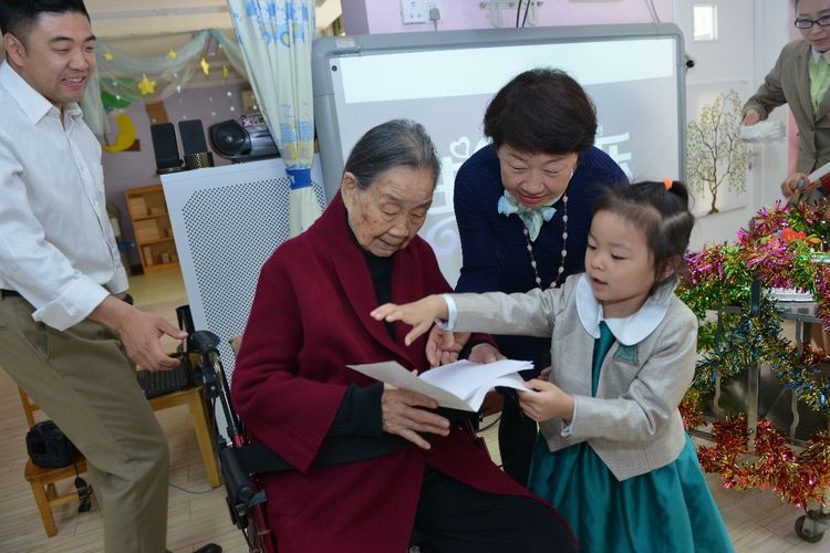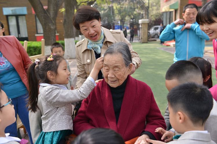 小朋友们争相和百岁老人交流