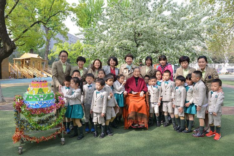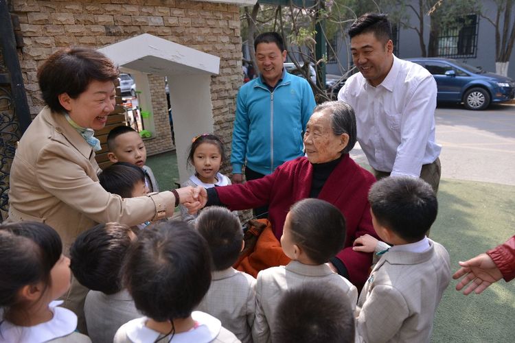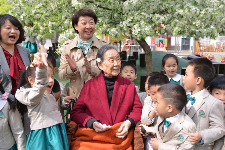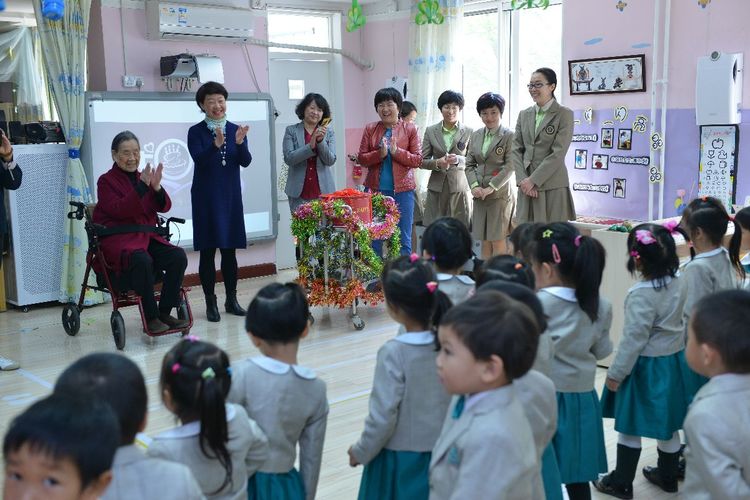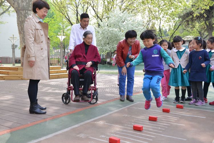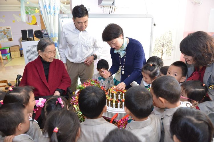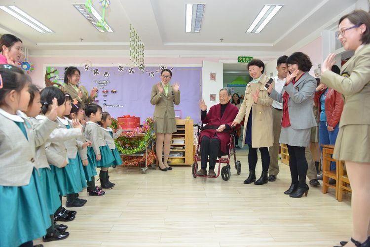 卢先生精神矍铄,身体硬朗。一大早,孩子们守候在门口,大老远看见卢奶奶来了,纷纷的围上去,有的把海棠花瓣捧到卢奶奶的手心里,有的把海棠花给卢奶奶带上,还有的小朋友大声说:“祝卢奶奶寿比南山,健康长寿”。卢奶奶高兴的说:“每次来幼儿园,看到可爱的孩子们,就能多活好几年”。卢先生还兴致勃勃的观看孩子们的户外活动,为跳远的孩子鼓掌、加油。和煦的春光记录了这温馨的时刻:在102岁的幼儿园里,100岁的卢乐山先生,孩子们快乐的游戏。这温暖的时刻穿越了历史,温暖着时光。温暖的时光穿越到了50年代,卢乐山先生陪同苏联专家戈林娜,观摩研讨九游体育实验幼儿园教师组织的教育活动。时光穿梭了半个多世纪,那时那刻,此情此景,浸润历史,愈久弥香。