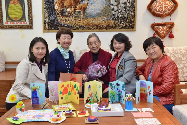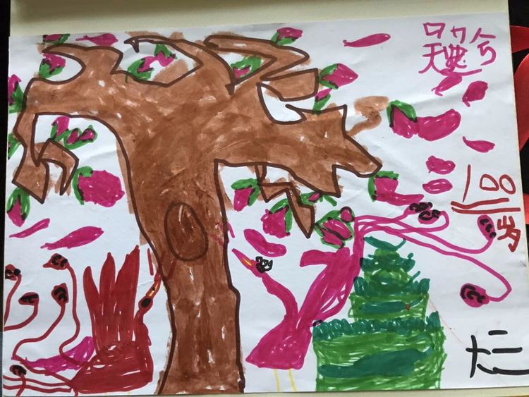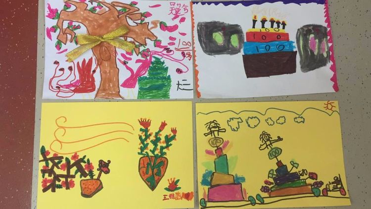 卢乐山先生来到小四班,小朋友用欢快的歌舞欢迎卢奶奶的到来。幼儿园食堂的老师亲手为卢先生制作了生日蛋糕。黄园长组织小朋友们和卢先生点起“100“岁的蜡烛,欢乐的生日祝福歌,温暖了幼儿园每个角落。可爱的孩子们还给卢先生送来了自制祝福卡片:“我给卢奶奶画了两个带轮子的蛋糕,像小车一样,能开到卢先生家里”。“卢奶奶一百岁了,来了两个凤凰,在玉兰树上跳舞”,“我为卢奶奶画一个春天的幼儿园,让卢奶奶天天看着美丽的幼儿园,天天开心”。稚嫩的话语,表达了孩子们纯真而质朴的情感。也表达了幼儿园对卢乐山先生深深的祝愿!
