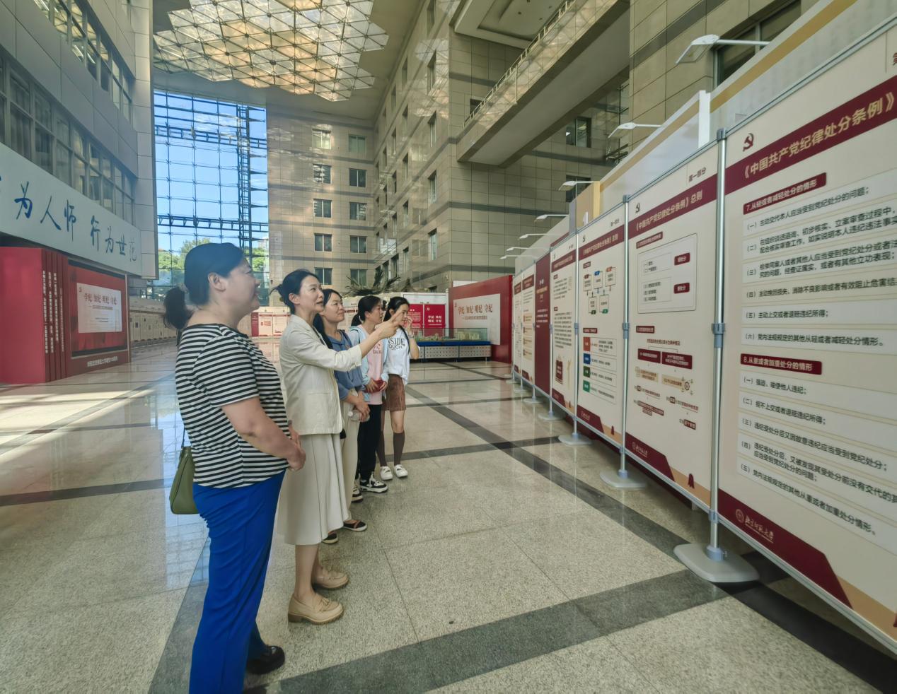 本次展览由学校党委和纪委共同主办,展览包括习近平总书记关于党纪学习教育的重要讲话、《中国共产党纪律处分条例》修订及其意义、《条例》内容以及典型案例等。通过图解的形式,展示了《条例》的内涵要义、违反“六大纪律”的主要情形和行为等;以文字加漫画或图片的形式,展出了近年来违反“六大纪律”以及违法犯罪方面的82个典型案例,每个案例链接《条例》的相关条文,使廉政警示逐步浸润到党员干部的心灵深处,帮助广大党员干部以案学纪、深化理解,筑牢廉洁自律的思想防线。