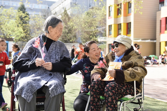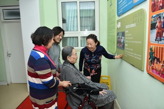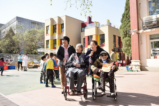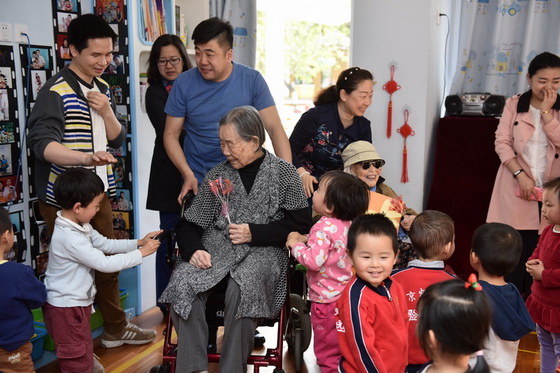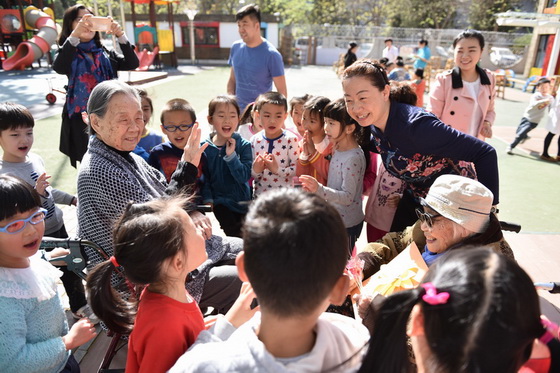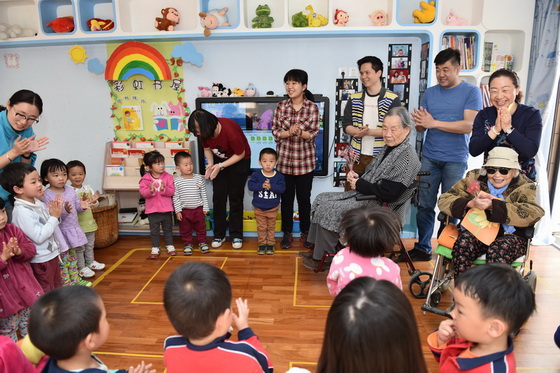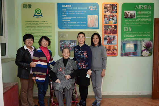 黄珊园长陪同两位百岁老人参观幼儿园班级活动