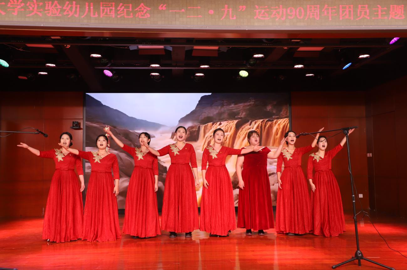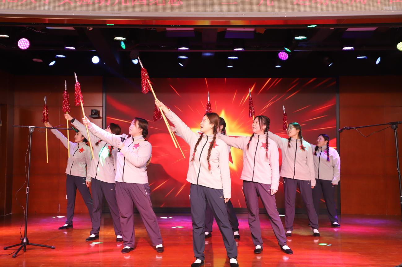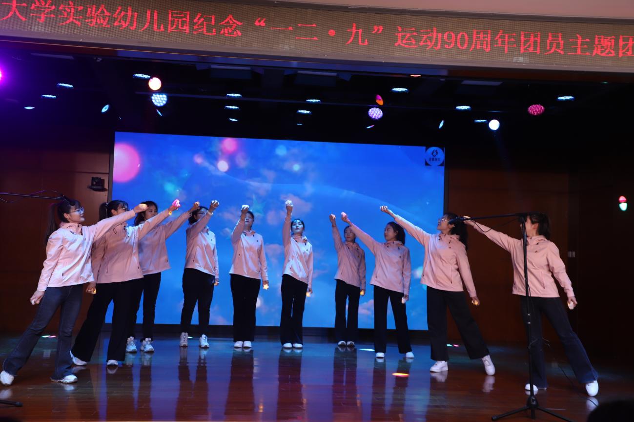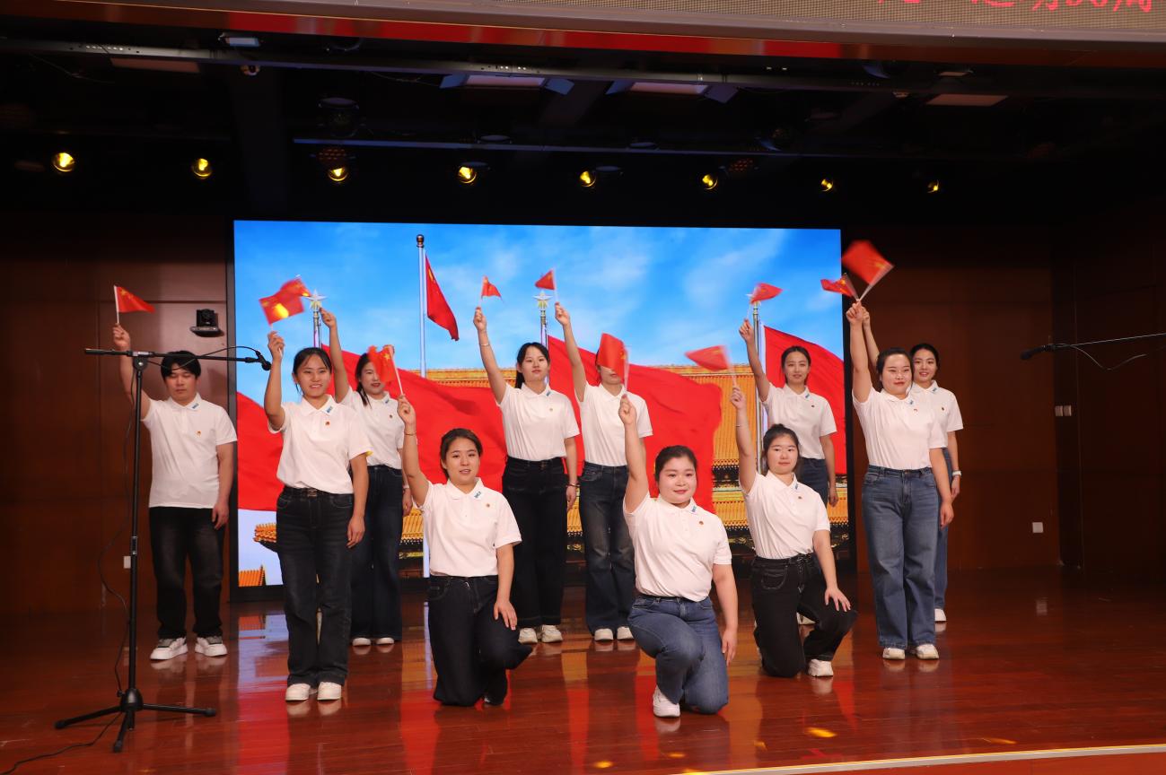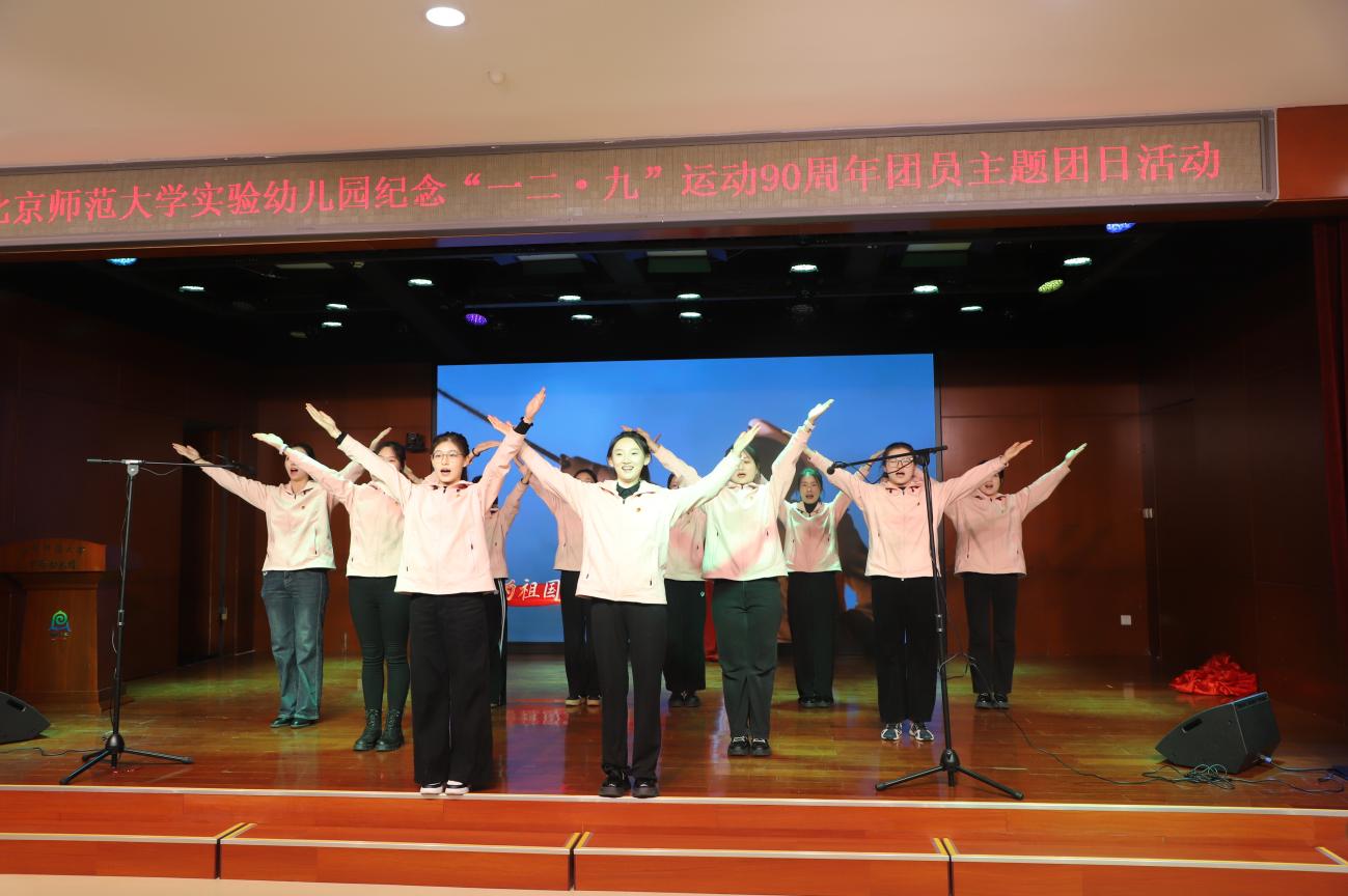首先,全体人员齐唱《中华人民共和国国歌》,之后各分园团支部依次登台献唱,用歌声传递爱国热忱:校本部园团支部以《红星闪闪》唤起红色记忆,以《我爱你,中国》献上深情告白;牡丹分园团支部用《歌唱祖国》抒发家国豪情;望京分园团支部借《大中国》传递民族自豪;明光分部团支部以《把未来点亮》描绘青春希望;龙樾分园团支部凭《强军战歌》展现热血担当。整场展演中,歌声、舞蹈与道具的巧妙配合,让每首歌曲都成了一段可感可触的“红色故事”,青春热忱与爱国情怀在舞台上交织共鸣,赢得现场阵阵掌声。最后,全体人员在望京分园团员教师王雪蕊的指挥下,齐唱共青团团歌《光荣啊,中国共青团》,以激昂旋律诠释青年使命,将活动氛围推向新的高潮。