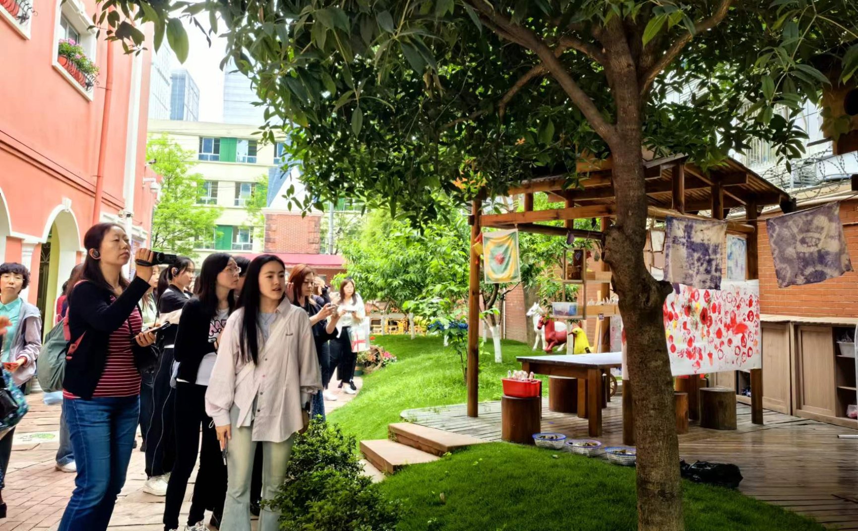 在红星幼儿园,我园教师首先参观了幼儿园的户外环境和各具特色的功能教室,特别关注了园方正在筹备的“阅历山海”活动。