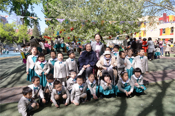 小朋友们与100岁的段裔老师、98岁的卢乐山先生及黄珊总园长合影