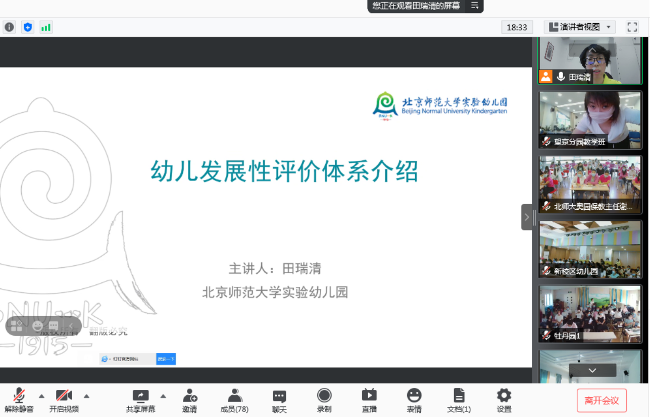 为做好幼儿发展性评价的全园普及工作,2021年8月27日,总部研究中心面向全体教学岗教师开展了“幼儿发展性评价专题培训”活动。培训采用线上线下结合的方式进行,由研究中心执行主任田瑞清主持。八所园和三个中心(研究中心、培训中心和发展中心)近600人参加了本次培训活动。