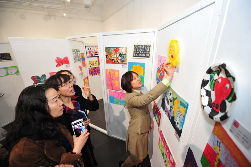 参加国际研讨会的嘉宾参观“百年有园”幼儿美术作品展