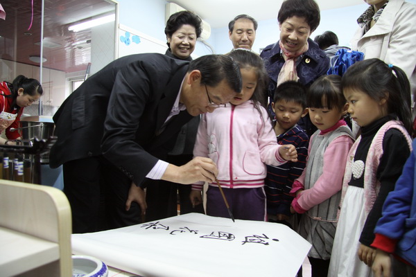 市政协委员、当代著名书画家淳一先生为小朋友题词“祖国花朵”