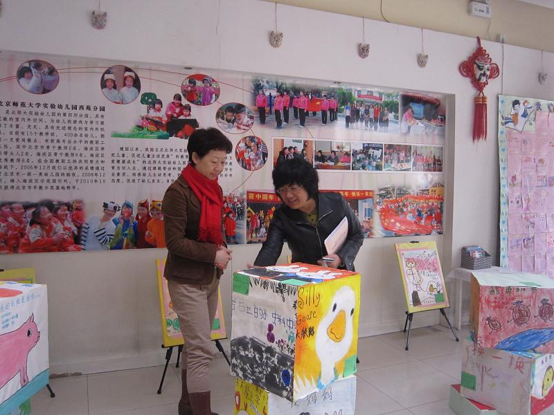 黄珊园长在教研观摩间隙与执行园长交流园所环境创设